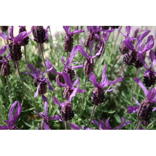 French Lavender (Lavandula stoechas) is a wonderful perennial heirloom variety that produces intensely fragranced, short, dense Violet flower spikes.  Flowers from Spring into Autumn.  Grows to a height of 1m.